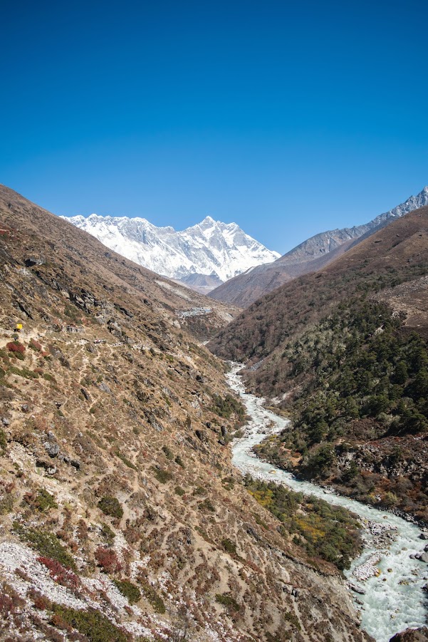 Every step here is monitored by the giant Lohtse at the far end of our sight. Reminds me of one thing…….. when you are standing next to your sibling who is the tallest of all, nobody cares how tall you are! Lhotse (8,516 m), the fourth highest mountain in the world, never gets the fame it deserves. In the presence of the mighty Mt. Everest right next to it, this can hardly be blamed. Goodbye to these forested lower areas; we are entering into the land of alpine scrubs now. Rhododendron trees in the Sagaramatha National Forest had already shed their flowers for the arrival of the winter which is just around the corner.